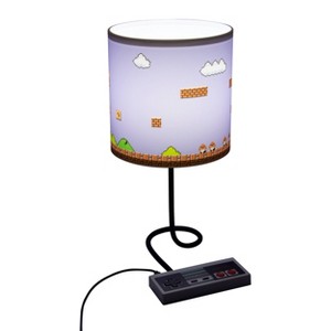 The lamp has a lampshade that features a classic Super Mario NES game, and the base is a classic NES controller. You can use the controller to turn the lamp on and off, and the brightness can also be adjusted using the D-pad.