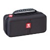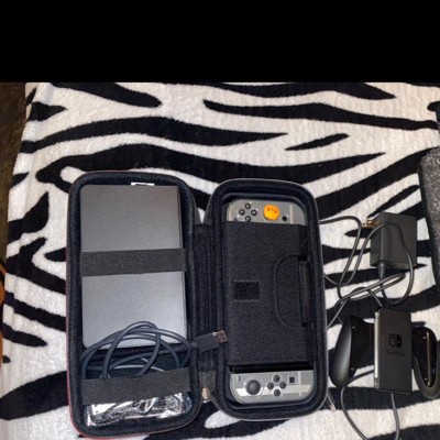 Nintendo Switch and Nintendo Switch OLED Model Game Traveler Deluxe System Case. The hard shell case protects Nintendo Switch OLED Model or Nintendo Switch System and accessories. The bottom tray has an elastic strap to securely hold Charging Dock, Pro Controller, or Joy-Con Grip. The padded divider has an elastic strap to securely hold AC Adapter and HDMI Cable. The case includes an adjustable viewing stand and the recessed insert firmly holds either Nintendo Switch or Nintendo Switch OLED Model with or without Joy-Con Action Grips. The case includes a comfortable carrying handle along with 2 game card cases that hold 4 Nintendo Switch Game Cards and are stored neatly beneath Nintendo Switch System. 2 Micro SD Card Cases are included to protect any expanded storage. NNS4000