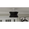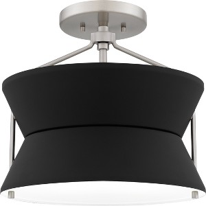 - Brushed nickel finish pairs with matte black shade for two-tone contrast