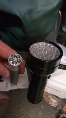 Rock hunting with a UV light at night? You will see the rocks that glow. I found my first orange youpolite Rock on north shore in MN. I had my 50 led blacklight and my new Inova x5. You can see the 50 led barely made the youpolite glow and the Inova x5 everything was glowing brightly. See pics below . I highly reccomend the Inova x5 for this type of Rock hunting.... happy searching!!!