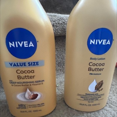 - One 33.8 fluid ounce large lotion pump bottle of NIVEA Cocoa Butter Body Lotion, New Look and Formula, Value Size