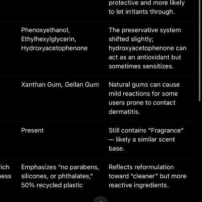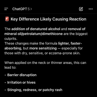 Yea this gave me new skin alright! I’d been using this product for the past couple years. Noticed the new cap but not that it was a new formula. My entire body is burning and covered in red hives. I asked chat gpt to compare the old bottles’ ingredients (still had a tiny bit left) with the new bottles’ ingredients to see what can be causing it.