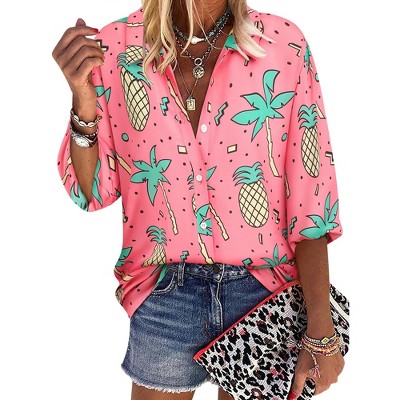 Nlife Women's V Neck Puff Sleeve Hawaiian Shirt Floral Tropical Boho Blouse Hot Pink M