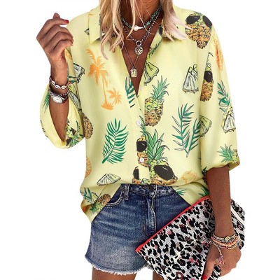 Nlife Women's V Neck Puff Sleeve Hawaiian Shirt Floral Tropical Boho Blouse Yellow S