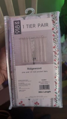 Add botanical charm to your kitchen or other small windows with the floral stripe printed design of Riverwood Kitchen Curtain Tier Pairs by No. 918. Gently filters light while enhancing privacy. Rod pocket design allows for easy hanging on a standard curtain rod up to 0.75" in diameter. Machine washable. Ideal layering piece for added privacy and light control. Tier pair includes two (2) tier curtain panels Set includes two ivory tiers measuring 54" width by 36" length. Coordinating valances or swag pairs are sold separately. Measure carefully before selecting your desired size. Rod not included. Machine wash cold on gentle cycle. Use only non-chlorine bleach when needed. Tumble dry on low heat, using a cool iron as needed.