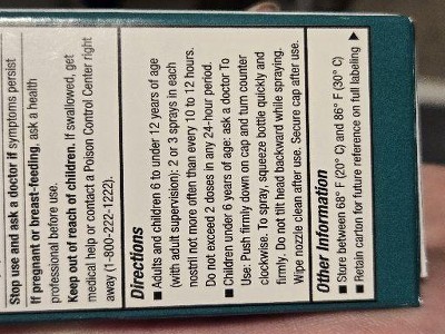Directions Adults and children 6 to under 12 years of age (with adult supervision); 2 or 3 sprays in each nostril not more often than every 10 to 12 hours. Do not exceed 2 doses in any 24-hour period. Children under 6 years of age: ask a doctor To Use: Push firmly down on cap and turn counter clockwise. To spray, squeeze bottle quickly and firmly. Do not tilt head backward while spraying. Wipe nozzle clean after use. Secure cap after use.Other information