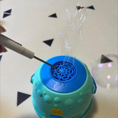 A: The bubble machine comes with a bottle of bubble solution to start playing immediately.