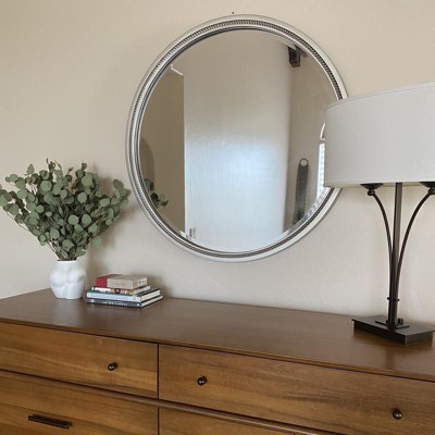 I love the elegance of this silver beaded mirror. I was looking for a large, round mirror and happy I stumbled upon this mirror. It was the perfect addition placed above the dresser.