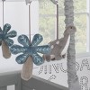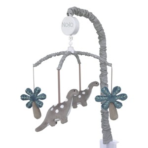 This NoJo Baby-Saurus Musical Mobile features two plush dinosaurs and two plush palm trees. Also included is a gray sleeve for the cross bars and arm. This musical mobile will soothe your baby to sleep by gently spinning. Plays Brahms Lullaby. Includes mobile parts for mounting and easy to follow directions. Measures 12" x 29". Sticker is optional. Wind up music box included.