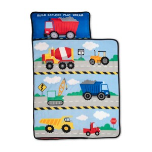 NoJo Construction Toddler Nap Mat - Includes Removable Pillow and Attached Fleece Blanket! This colorful toddler nap mat featuring a vibrant construction vehicle design is sure to inspire your little one to explore dreams of great adventures. So soft and comfortable, this nap mat is perfect for naptime, sleepovers, daycare or overnight trips. A quilted mat, ultra soft fleece blanket and removable pillow all in one. The nap mat rolls up with Velcro closure tabs and convenient carrying handle, plus it includes a tag for personalization.