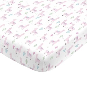 - The NoJo Pink Llama Fitted Crib Sheet features shades of pink, green, pale blue and white, all on 100% polyester microfiber fabric.
