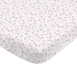 - The NoJo Pink Unicorn Fitted Mini Crib Sheet features shades of soft pink, green and white, all on 100% polyester microfiber fabric.