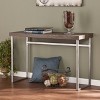 This tall console table is the perfect accent to finish out a living room with style. Place it behind a couch with a lamp or against a flat wall with a plant to bring energy into your space. Featuring a striking burnt oak finish top with a weathered gray look, this table has the personality to blend with many styles of decor. Supported by metal, U-shaped table legs with a silver powder coated appearance, this table will become the showpiece in any living room. Perfect for displaying family portraits or simply holding miscellaneous items. This console table looks fabulous in homes with contemporary to transitional styles.