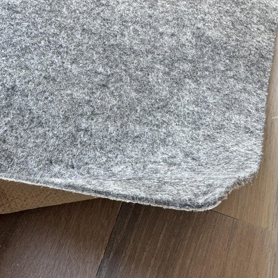 I bought this rug pad to go with a jute Threshold runner that didn’t have any kind of lining, and it’s perfect! This felt pad has a thin, rubbery material at the bottom that keeps it stuck to my hardwood floors, and does it in a gentle way. It definitely will not damage my floors in the slightest. The pad adds a little cushion, but not a significant amount, and I can see myself ordering more in the future to get a little bounce in other thinner area rugs. (I’ll check to see if this brand offers a thicker pad, too.) Admittedly, it smelled a little like nail polish remover when I pulled it out of the bag, but the smell did not last long and I didn’t need to off-gas it outside. The pad is bigger than my runner, and is meant to be cut down to size to get a custom fit. I plan to use the scraps for beneath plants. :) I highly recommend this felt rug pad and I will come back for more in the future.
