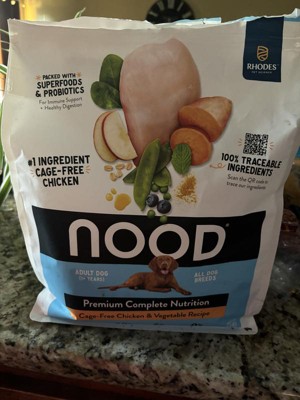 Reviewing the Nood cage free Chicken and vegetable premium complete nutrition recipe one year plus dog food. I have given my dry a half cup this dog twice a day, in the morning and in the evening. My golden retriever seems to really enjoy this food with no stomach issues or skin issues.