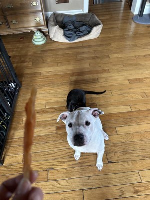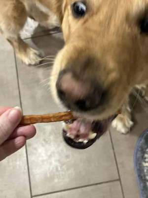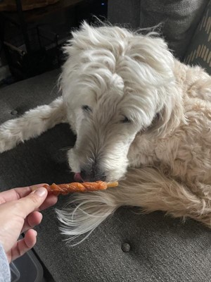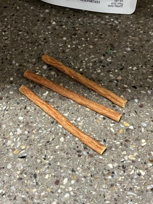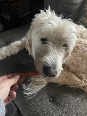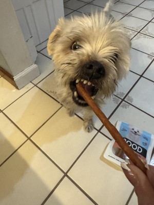 My dog absolutely loves these! He gets so excited when I take one out of the package. I like that he doesn’t immediately eat the whole thing and it takes him a little bit to work through it. I love that there is no rawhide so they are safe for my dog.