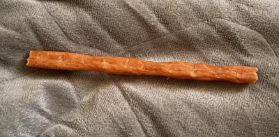 Hey worldwide web users, Today my review is on Nood Premium Chewy Sticks dog treats. They are stated to have no artificial flavors, made for all dog breeds and sizes and made from real chicken. I see that Nood has a website Noodpetfood.com listed on their bag maybe for more information or further products made by them. It says only 23 calories per treat which I’m not sure why it would matter unless your dog is on a restricted diet and if that is so they probably shouldn’t be having any treats to begin with. Anyways, the nice thing is the package is resealable and the treats are the right size for my extra small dog at full size only weighs four pounds. If it was a bigger dog they would just snap it in half with one bite and be done with it but for his breed it would be worthwhile as he can chew on it for quite a while for enjoyment and flavor and to get the plaque off their teeth. As I opened the bag the smell is quite pungent I am not sure how to describe it I am sure it’s supposed to be the natural cherry wood smell I suppose but for me it was off putting and quite frankly just plain stinky. I would say my fading probably wholeheartedly agreed as he is not picky on food or treats pretty much had an interest in anything put in front of him and rarely turns anything away. I put it in from of him no response. I teased him with it playfully he took it chewed it for about five seconds and spit it out. It took a lot to get him interested in it and after the initial taste it laid in front of him with no further interest or minute peak in looking the way towards it the rest of the day. The treat its self is roughly about six inches I would say tan colored almost spirly and a very distinct smell that can’t be defined. I’m have to say thumbs down on this and I wouldn’t buy it as my dog seemed to say No sir to it. Sorry Nood try again.