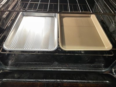 Perfect size cookie sheets! Love that it comes in a two pack that’s heating rust proof aluminum! The gold look is so pretty! Bummer it’s hand wash only but that’s okay! So far I’m loving them and how sturdy they are. Hoping they will continue to hold up & stay looking great as time goes on!