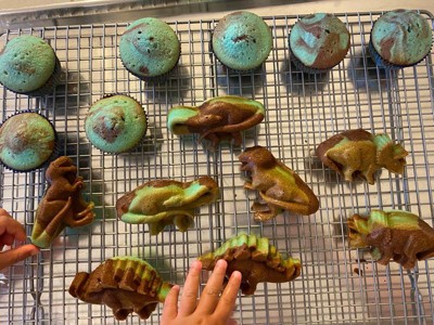 I randomly stumbled on these pans on amazon... but when I started to search for more designs that my boys would love I didn’t find them. Target to the rescue! I found dinos! My boys are so into dinos that I was so excited to receive this pan. I love Nordic Ware anything! As usual Nordic Ware doesn’t disappoint. It’s a beautiful heavy piece and the dino designs are not only great but they bake out wonderfully!! My 3 and 2 year olds were so excited to eat their little Dino cakes—as they called them. This is my first cakelet pan, so I didn’t know what to expect when I took the dinos out. Did they stick? Did they really look like the cakelet design? Just a sprinkle of flour before I poured the batter was all it needed. And everyone was happy. This is one happy mama with her happy kiddos... I can now be more creative than I need the skills for... haha :)