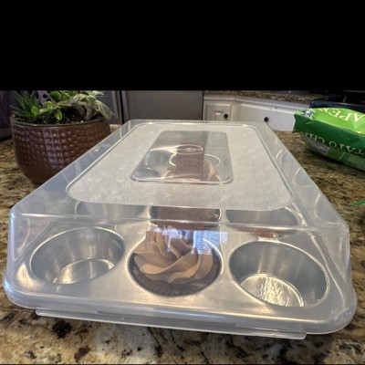 The pan is great for baking cupcakes and muffins. They come out just fine. There is plenty of room for lots of icing and it's great to have a cover. BUT...you almost have to 'wrestle' with the lid to get it off. I don't know if there's a trick to it that I can't figure out, but it is very hard to get the lid off. Other than that, it's great!