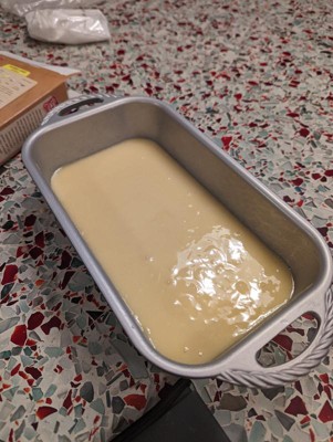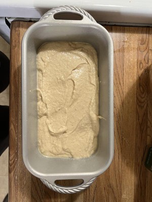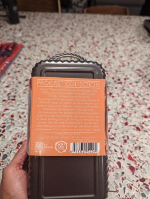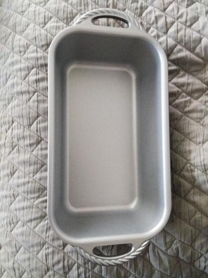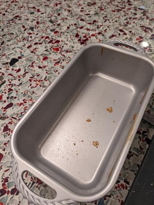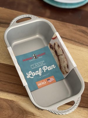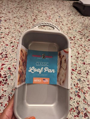 Nordic Ware Classic Cast Aluminum Loaf Pan This pan is awesome. It is a little bigger than traditional loaf pans I have used in the past which is nice. The pan perfectly cooks my bread. It is easy to clean because the pan is non stick, which keeps me from having to do all the scrubbing to clean like other pans. I love the little handles on the side helps me with getting the pan in and out of the oven. I see this pan lasting a long time.