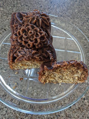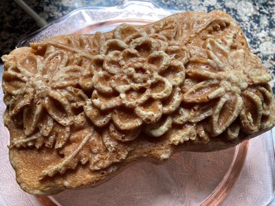 I’m going to start by saying that this pan exceeded my expectations. I had a sense of elaborately shaped pans as kind of a pain that don’t usually give good results (ie difficult to actually get the cake out without it breaking, sticking, whatever and hard to clean). But my cake actually came out beautifully and easily without sticking or breaking. I didn’t have any cooking spray, so I used melted butter and flour to coat the pan and it still worked fine! I made a hot milk cake in it, and it caramelized the outside perfectly. I was concerned that washing it was going to be a big pain because you aren’t supposed to put it in the dishwasher, and there are a lot of nooks and crannies. But I was pleasantly surprised there too- the material cleans super easy and while there were a few tiny bits stuck here and there, the pan material made it easy to get them off. I just washed it with soap and water and a paper towel to get in the small parts and it didn’t take more than a minute. The only hint I have to share is that when the cake out of the pan, obviously the bottom becomes the top and vice versa. Well, the top is probably domed so cut it a bit to level it so it sits flat. Anyway, easy to deal with pan that makes pretty cakes! No complaints and I’ll definitely use it next time I want to impress someone!