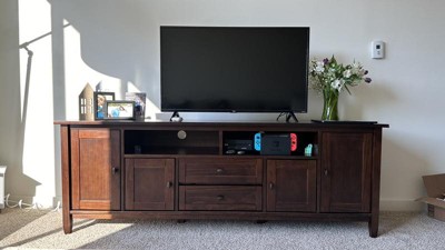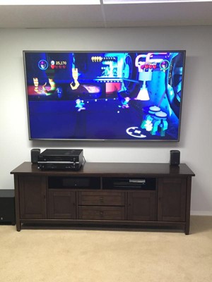I have been searching for a TV stand large enough to fit a 75 inch TV without dwarfing the cabinet. I thought that I had found the perfect piece. This appealed to mean because it was large, solid wood, and unique compared to other options. At a price nearing $700, I expected a lot of this furniture, but was sorely disappointed. Upon unboxing this item, I quickly noticed that the wood had many imperfections. There were scratches, uneven stain, and poor quality areas (as if it were not sanded). Additionally, this is a soft wood that dings rather easily. The assembly of the item can be a bit tiresome as it takes some time and many of the required screws are in hard to reach places. After it was put together, I noticed that the top board cracked right in the center. While still sturdy, it made me uneasy and was a massive eyesore. Very disappointed in this product and will be returning due to the quality issues. This is not what you’d expect of a piece at this price.