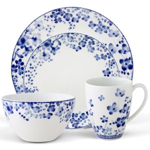 - Set includes 1 dinner plate, 1 salad plate, 1 bowl, and 1 mug