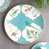 Lodi’s Morning is a white porcelain pattern, featuring designs inspired by the famous Lodi Gardens in India. The salad plate depicts striking florals and a parakeet in a beautiful blue shade with touches of saffron and ruby, while the other items feature a bold rim of florals within a repeating ogee border. The salad plate also features a parakeet. A delicate gold outeredge banding finishes this delightful pattern. Lodi’s Morning is dishwasher safe and intended for daily use.