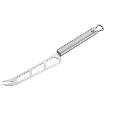 The serrated blade and cut-out sections allow the knife to glide through angel food cake gracefully. Works for "sticky" cheese like Chevre and Brie too.The handle has a patented shape, ergonomically designed to fit perfectly for right or left-hand use. The oversize handle and finger indents give a great hold without strain and keep hands clear of the tool's functional surface.Constructed with a durable serrated stainless steel blade. Dishwasher safe. Measures 11 inches long overall.