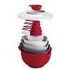 - 12-Piece Set: The Norpro Nested Mixing Bowls and Measuring Cups set includes an egg separator, lid, splatter guard,4 measuring cups, (1/4C / 60ml, 1/3C / 85ml, 1/2C / 125ml, 1C / 250ml), a scoop with 2C / 500ml measure marks, flour sifter, and 3 mixing bowls, (2QT / 64oz, 3QT / 96oz, 5QT / 160oz), providing a comprehensive range for different cooking and baking tasks.