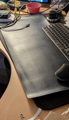 Desk mat has a soft, leather-type feel. It’s a little stinky right out of the box. Has one of those weird plastic key smells, but it airs out pretty quickly. I am going to have to leave it upside down for a little while or put something heavy on it to get it to flatten out. It works great with my mouse, and provides a good surface for writing. Overall, I expect I will be happy with it once I can get it to lay flat