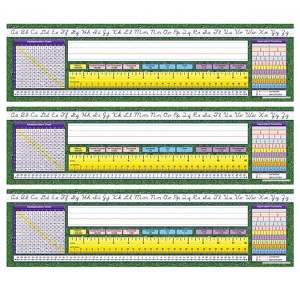 North Star Teacher Resources Modern Cursive Intermediate Desk Plates, 36 Per Pack, 3 Packs | Improve learning levels with these handy desk references. Simply write in students names and tape to students desks for year-round use. Intermediate desk plates include alphabet line, name plate, place value, 12'' (30 cm) ruler, number line (-30 to 30), 12 x 12 multiplication chart, temperature chart, and equivalent fractions. Measures 19 x 5" (48.3 X 12.7 cm). Includes 36 per package. Sold as 3 packs, 108 desk plates total.