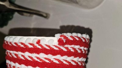 Alternating design of solid red, red and white striped, and white mini pom-poms