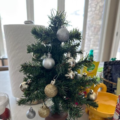 Add a tree-mendous accent to your space with this adorable mini holiday tree! This Canadian pine is the quintessential little artificial holiday tree, measuring just a foot high with a small 9.5-inch base diameter, making it the perfect size for desks, side tables, windowsills, or tucked into a festive vignette. It features a full profile of two-tone green needles, giving this artificial pine tree a wonderfully dense and realistic appearance—talk about big personality in a small package! This sweet tree comes firmly secured in a faux wood base, giving it a playful touch of woodsy appeal that looks great right out of the box (with no assembly required!). With 40 tips featuring bendable wire branches, you get total creative freedom to fluff it out and drape it with micro-miniature ornaments, tiny tinsel, or a string of sweet fairy lights—the decorating possibilities are as vast as a forest! Whether you're decking out your home office or adding a cheerful touch to a kid's room, this unlit artificial holiday tree brings a fun and festive vibe wherever it goes. Product Features: Unlit 40 tips 1.75" wide branch tips Full profile tree Housed in a faux wood base No assembly required - the tree comes in one piece Bendable wire branches for easy positioning Recommended for indoor use only Dimensions: 12" high (from the base of the stand to the top of the tree) 9.5" base diameter (at the widest point) Faux wood base: 2" high x 3" diameter Material(s): PVC/metal/plastic Note: Branches are compressed for shipment, and need to be fluffed out upon arrival to look like the photo.