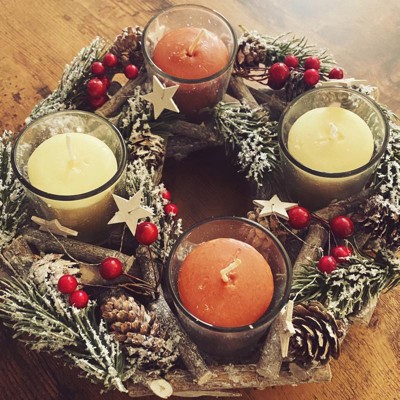 The gift recipient was really happy with this. She says it will fit nicy on her table all through advent for the perfect Advent touch. She's using the battery votives instead of real flame for a worry-free Christmas ambiance.