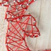 Features a red string reindeer that is anchored to a wood board with a natural finish