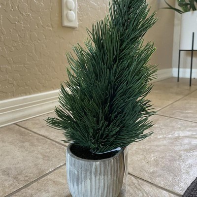 Liven up the holiday decoration with this mini tabletop holiday tree! The soft upswept pine needles add to the holiday spirit and your imagination can soar if you want to decorate this tree. Perfect for space-challenged homes, table centerpieces for a party or your home, or in your office space! Features: Artificial tabletop holiday tree Fir pine tree Great for art projects or hobbyists Textured, white, cement base Base measures 3 inches diameter and 3 inches high Tree is approximately 10 inches high Tree extends beyond the edges of the base Dimensions:13.25" high x 5" diameter Material(s): plastic/cement