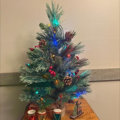 This mixed Cashmere pine holiday tree is a no-brainer when it comes to decorating small spaces. Showcasing long needle bottle brush tip, this decorative piece is bound to liven up the holiday feeling. The tree is made complete with pine cones and red berries. Product Features: Unlit 48 tips 1.5" - 3" wide tapered tips Medium profile tree Recommended for indoor use only Country rustic burlap base tied with twine Bendable wire branches for easy positioning Dimensions: 24" high (including the base) Distance from floor to the first row of branches: 5" 16" base diameter (at the widest point) Material(s): PVC/metal/burlap Note: Branches are compressed for shipment, and need to be fluffed out upon arrival to look like the photo Note: Cashmere Pine is another great design style from Northlight. Easily coordinate our trees, wreaths and garlands in this style. No actual cashmere is used in this product.
