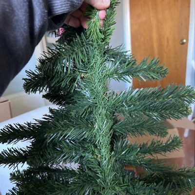 The back of this wall tree is flat. You simply hang the tree wherever you want to make a dramatic statement. This tree is so much fun and a real space saver. Perfect for dorm rooms, small apartments, doors or anywhere there is not enough space for a regular tree. Product Features: Unlit 57 tips 2" wide tapered tips No assembly required – tree comes in 1 piece For indoor use Comes ready-to-hang with a loop on the back Dimensions: 2' high (from the base to the top of the tree) 18" base diameter (at the widest point) Material(s): PVC/metal Note: This tree does not come with a tree stand, it is meant to be hung on the wall or on a door"Note: Branches are compressed for shipment, and need to be fluffed out upon arrival to look like the photo.
