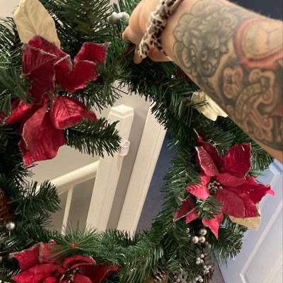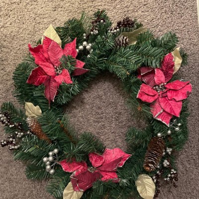 Add this beautiful holiday wreath to your holiday decor! The wreath features purple poinsettias with gold leaves. The silver pine cones, cranberries, and black sparkling berries for the perfect mixture of color to capture your guest's attention. This 24-inch wreath works perfectly at home or at the office, bringing a bit of holiday cheer wherever you go.