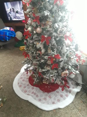 This holiday tree skirt is the perfect finishing touch to your holiday decor. It is accented with red glittering snowflakes and the scalloped edge and vibrant red and white color scheme create a classic look that will complement any holiday tree. It's easy to use and fits perfectly under your tree, protecting your floors and adding an extra layer of charm to your holiday display. Add this beautiful tree skirt to your collection today and make your holiday celebrations even more special.