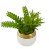 Introduce natural texture and color to interior spaces with a potted mixed artificial succulent arrangement. Designed for modern and transitional settings, the lifelike artificial greenery features a variety of succulent species arranged to mimic natural growth patterns. Each artificial plant is crafted with attention to realistic shape, shading, and detail, offering a maintenance-free way to enjoy botanical beauty year-round. Nestled in a stylish ceramic pot with a glossy gold and white finish, the arrangement combines earthy charm with a touch of contemporary elegance. The base is filled with faux dirt and stone, providing a grounded and stable look while keeping the plants securely positioned. This combination of materials delivers visual contrast and depth, making the piece ideal for tabletops, bookshelves, or office desks. Whether placed in a living room, kitchen, bathroom, or entryway, the arrangement serves as a low-maintenance decor option that doesn't require sunlight, watering, or pruning. Its compact size makes it easy to move and display in small spaces while still offering a vibrant splash of greenery. With lasting color and structure, this artificial succulent arrangement makes an excellent choice for anyone looking to create a calming, organic vibe indoors—without the upkeep of live plants.