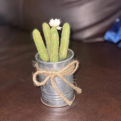 Mini faux erect thorny columnar cactus with a soft pink flower