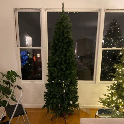 Your home will be the talk of the town this season when you have this lighted artificial holiday tree. This tree with tiny luminaries on it elegantly emphasizes your space. Onlookers will be amazed by the beauty of this holiday decor. Product Features: Pre-lit with 400 clear lights Bulb size: mini 1099 tips 2" wide tips 36" lead cord Additional Product Features: Slim profile tree Hinged branch construction Light sets on tree are UL certified and approved for indoor or outdoor use, however, the tree itself is recommended for indoor use only If one bulb burns out, the rest will stay lit Lights are equipped with Lamp Lock feature, which makes them replaceable, interchangeable and keeps them from falling out Comes with replacement bulbs and spare fuses 4-piece easy assembly (including stand) Comes with a FREE black metal tree stand Wire gauge: 22 120 volts, 60 hertz, .34 amps, 40.8 watts Dimensions: 7.5' high (from the base of the stand to the top of the tree) Distance from floor to the first row of branches: 12" 32" base diameter (at the widest point) Material(s): PVC/metal/glass bulbs/wireNote: Branches are compressed for shipment, and need to be fluffed out upon arrival to look like the photo.