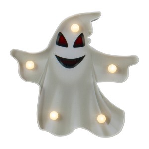 Illuminate your Halloween decor with this lighted Halloween ghost decoration, a playful yet spooky accent perfect for indoor or covered outdoor displays. Featuring a classic ghost silhouette, this wall or shelf decoration glows with super bright LED lights that give it a modern flair while maintaining the fun, eerie vibe of the season. The energy-efficient LEDs are built to shine all night long, making this a reliable centerpiece for Halloween parties, haunted house setups, or porch displays. Designed with convenience in mind, this lighted ghost marquee includes a built-in keyhole loop on the back, making it simple to hang on a wall, door, or anywhere you want to add glowing charm. The lightweight design allows for easy mounting and repositioning, so you can customize your spooky setup with ease. Whether you're creating a haunted entryway, decorating a child's Halloween party, or adding to your festive home decor, this LED light-up ghost sign is the perfect finishing touch. Combine it with pumpkins, spider webs, skeletons, and other Halloween lights for a complete themed display. Add a glowing dose of frightful fun to your seasonal setup with this eye-catching and energy-efficient Halloween marquee decoration.