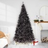 Make this holiday uniquely eerie with this exquisite tree in sleek black. With its elegant shimmering tinsel branches, this unlit masterpiece offers endless customization possibilities. Deck it out with your favorite lights and ornaments to create a truly personalized festive display. Complete with a solid black metal stand, this versatile tree is perfect for both traditional holiday celebrations and Halloween themes.