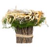 Create a charming Easter centerpiece with tabletop decoration. This arrangement features delicate white and brown speckled eggs nestled in a rustic nest made from dried oat, dried grass, feathers, greenery, and twigs. The nest is elegantly perched upon a bundle of wooden twigs artfully wrapped with natural jute rope, making it the perfect addition to your Easter table decor. Celebrate the season with a touch of nature's beauty and a hint of rustic charm.