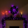 Make a bold statement this season with this striking 24" black crystal pine Halloween wreath. The shiny finish adds a sleek, modern touch, while 50 vibrant purple LED lights create an eerie glow, perfect for welcoming trick-or-treaters. Designed for both indoor and covered outdoor use, this Halloween door wreath is a must-have for anyone looking to set the perfect spooky scene. Whether hung on your front door, above a fireplace, or as part of a larger display, this eye-catching wreath is sure to be a standout piece in your Halloween decor.