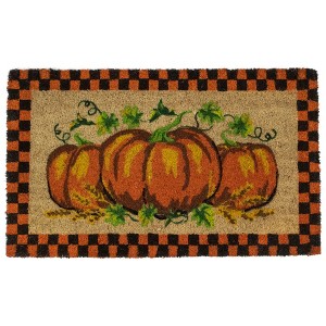 Give a cheerful greeting to guests with this eye-catching, fall harvest pumpkin doormat. Thick and durable coir fibers are perfect for wiping feet and stopping debris from entering your home or office. This mat features a pumpkin design with an orange and black checkered border. Enhance your entry or patio area with a new doormat that fits your Autumn, Thanksgiving, or Halloween decor!